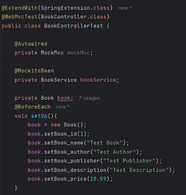 Create a folder for the controller test class at the path: test > controllerCreate a TestController class inside this folder. Implement a setup() function annotated with @BeforeEach. This function initializes new objects to be used in the save, edit, and delete functions. Implement the showAllData() function. Run the showAllData() function…